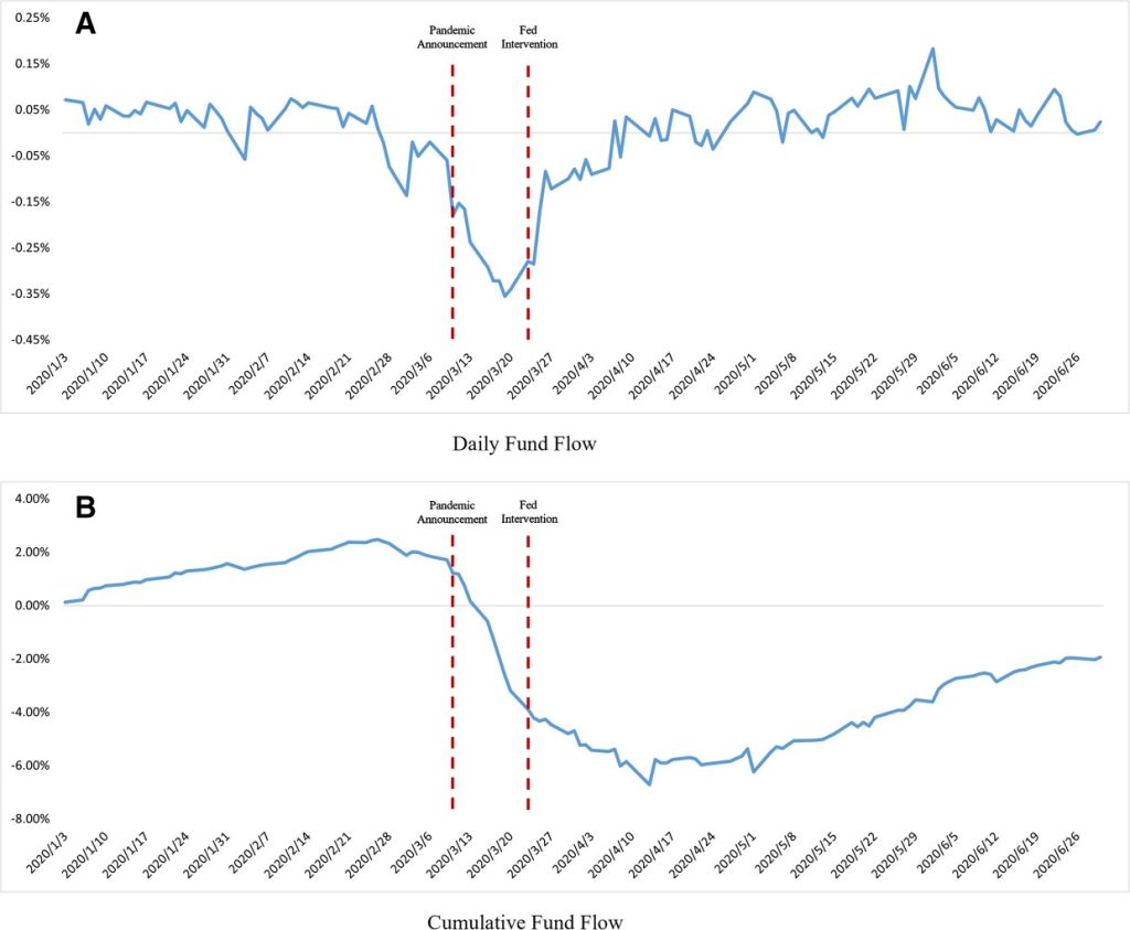 To illustrate these findings, starting in early March 2020 and before the COVID-19 pandemic was officially declared, bond funds saw sharp outflows. This aligned with previous research. From the study findings, withdrawals exceeded 5% of pre-COVID values.