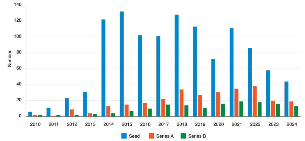 One important caveat of the data points in Figure 2is the material lag in the reporting, so it is very likely that the number of startups incorporated in 2022-2024 is higher than the numbers reported by Crunchbase. However, more complete data from Startup Genome on Seed, Series A, and Series B financings, which represent not startup formation but when they were financed, confirms this slowdown (Figure 3).