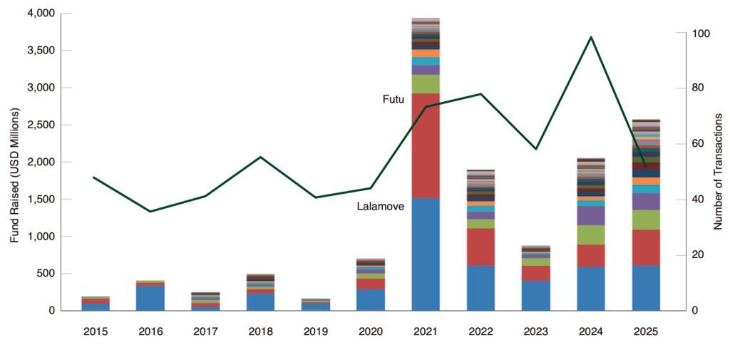 In contrast to the recent rates of startup formation, the financing and funding environment in Hong Kong remains robust. The number of financing transactions had been rising, with a decline in deal size in 2022-2023, which is in line with the global startup financing environment, followed by a strong rebound in financing activity in 2024 and 2025 YTD (Figure 7).