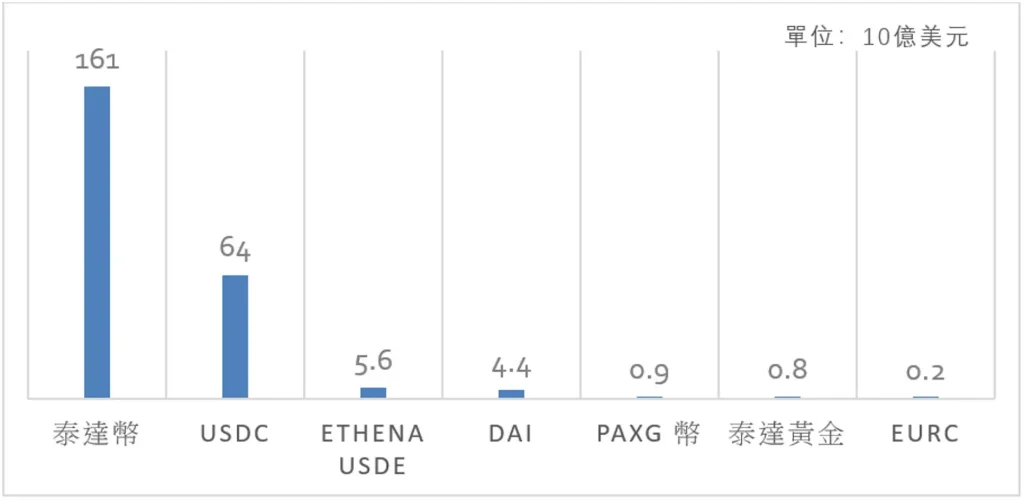 Not a new product in the financial market, stablecoins have a global value of US$239 billion, over 99% of which are backed by the greenback. USDT and USDC, the two most dominant stablecoins (see Figure), are both linked one-to-one to the US dollar, with a combined market capitalization far exceeding the total of all the other stablecoins. PAXG and Tether Gold are gold-backed stablecoins while EURC is pegged to the euro.